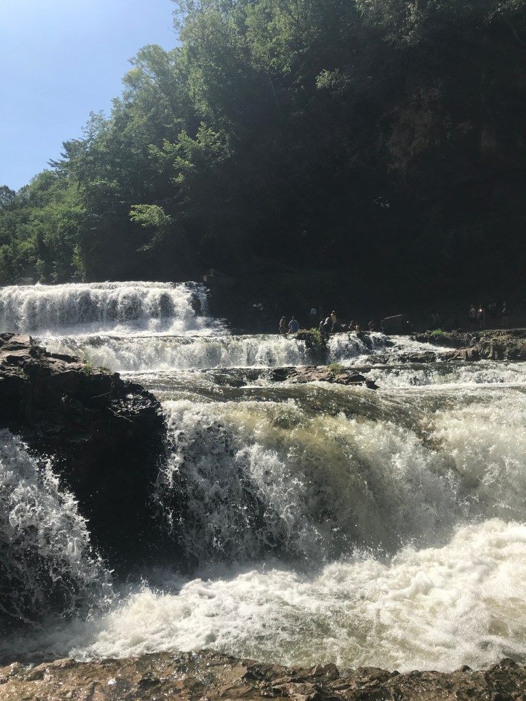 The falls did not disappoint! They were gorgeous and there was lots of rocks to sit on and get your feet wet! Wyatt enjoyed kicking off the hiking boots and playing in the puddles on the rocks. The falls had quite the current so I kept him away from the rocks edge but some people were playing right in the falls so I do not believe it was very deep, maybe 4-6 feet. It was a nice area to explore and there were more trails on the other side of the falls. There is no real picnic spots to camp out for the day, and it was crowded so hard to claim a spot at all. Go early, or go during the week, for the best experience!