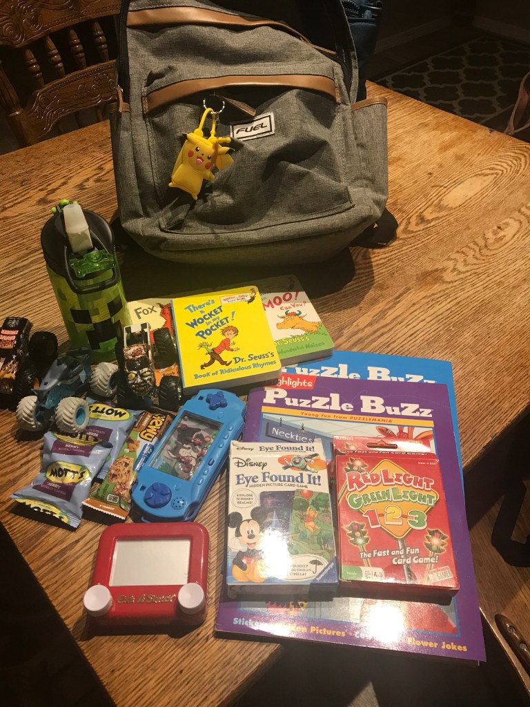 2. A handful of small toys; trucks, cars, dolls, etc. The rule is they MUST fit in the bag, not make noise (you will thank me for this later), and not be anything they are tempted to throw at the driver.