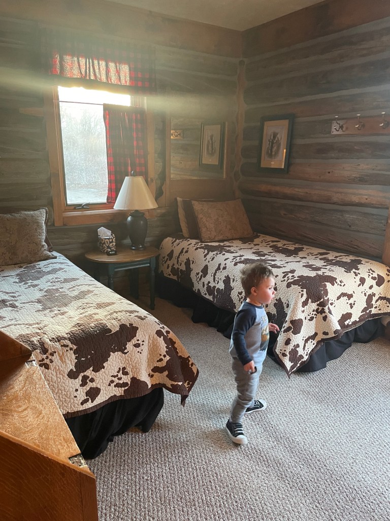 We stayed with our two boys in the Riverside Suites and did the Bed and Breakfast style stay. The suites were literally right next to the river. They had a nice patio area and a riverside boardwalk that would take you up to the main lodge. The patio had chairs on it, and I would have LOVED to spend hours listening to the river and reading a book but it was still a bit chilly out for that. (Next time if my butt is not on a horse, its going to be in those chairs). The suites had a queen bed in one room with a sitting area and a nice gas stove/fireplace. In the next room were two twin beds, ideal for kids (that stay in their own beds all night..eyeroll since my kids don’t sleep) or for other adult guests. The bathroom had a shower, his and her sinks, and bonus….a washer and dryer!!