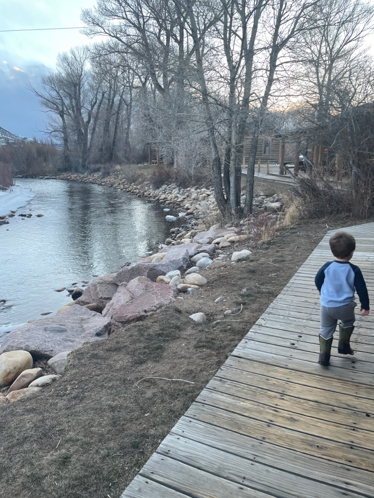 That is how I ended up sitting in this chair, in the corner of the rustic lodge writing this very blog. The hardwood floors creaking with every step someone makes, and the boys clicking across the floor in their little cowboy boots. Roughcut timbers serve as the structure for the lodge, and local wildlife decorate the walls. To my left is a nice cozy fieldstone wood burning fireplace that is lit every morning when we come in to enjoy the breakfast portion of the B&B package I booked. Outside you can see other structures of the ranch within view and some nice bench swings surrounding a fire pit. Today everything is covered in snow, but that is life in the foothills. It is peaceful and so quiet you can almost hear the snowflakes landing on the trees and the river.